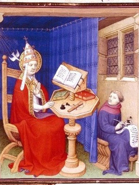 A l'inverse, le scribe peut être représenté à l'extérieur de son atelier ou lieu où il exerce. Ici on voit qu'il est derrière un rideau à l'écart du dais où trône Saint Grégoire.